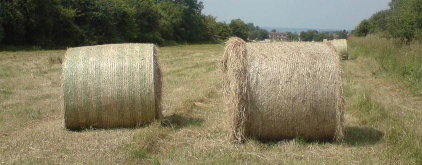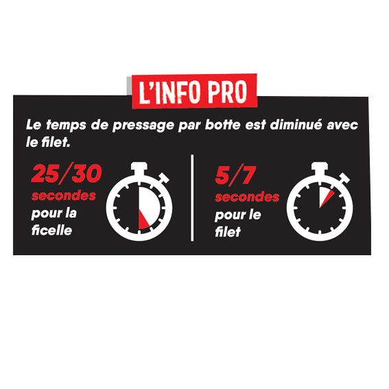 LES FICELLES ET FILETS De nombreuses exploitations utilisent la ficelle sur les chantiers de pressage. Cependant, les filets sont de plus en plus utilisés sur les chantiers d’enrubannage. Les filets sont maintenant conçus afin d’envelopper les balles sur toute leurs largeurs sans créer l’effet bourrelet que l’on retrouve sur les filets classiques. Deux solutions sont actuellement proposées. Le filet recouvrant est fabriqué à partir du même polymère que les filets classiques, mais possède une largeur plus importante. |